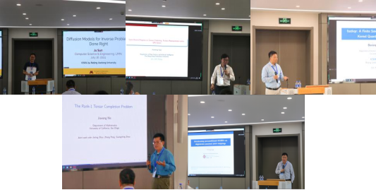 16日下午,大会报告由清华大学张立平教授、北京交通大学罗自炎教授、中国科学院张羊晶研究员、北京航空航天大学韩德仁教授和首都师范大学崔恒建教授主持。大会邀请了明尼苏达大学孙举助理教授进行报告。孙举助理教授提出了一种新型插件方法,对未知类型和水平的噪声具有很大的鲁棒性。香港理工大学袁雁城助理教授介绍了凸聚类模型的最新进展和新开发的求解器,使用GPU加速来求解凸聚类模型。爱荷华大学王勃祥副教授介绍了新算法fastkqr,其精度与最先进的算法相当,但运算速度要快一个数量级。加州大学聂家旺教授讨论了三次张量的秩1张量补全问题。证明了这个问题等价于一个特殊的秩1矩阵恢复问题,并提出了核范数松弛和矩松弛方法来解决此问题。香港理工大学孙德锋教授介绍了加速预处理交替方向乘子法,用于求解线性约束凸优化问题。加速预处理交替方向乘子法在求解凸二次规划问题上优于预处理交替方向乘子法。