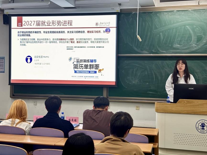 会上,陈斯阳老师结合详实数据,系统复盘2025届、2026届毕业生就业整体情况,清晰解读数学与统计学科相关就业去向,帮助 2027届毕业生精准认知就业前景。随后,陈老师围绕简历优化方法、实习岗位获取渠道等关键内容展开指导,鼓励同学们抢抓时间、提前规划、充分筹备。他提醒大家密切关注校院发布的就业资讯,主动对接市场需求;学院也将立足专业特色,持续开展简历一对一修改、专项求职辅导等精准化就业服务,全方位助力同学们提升求职竞争力。