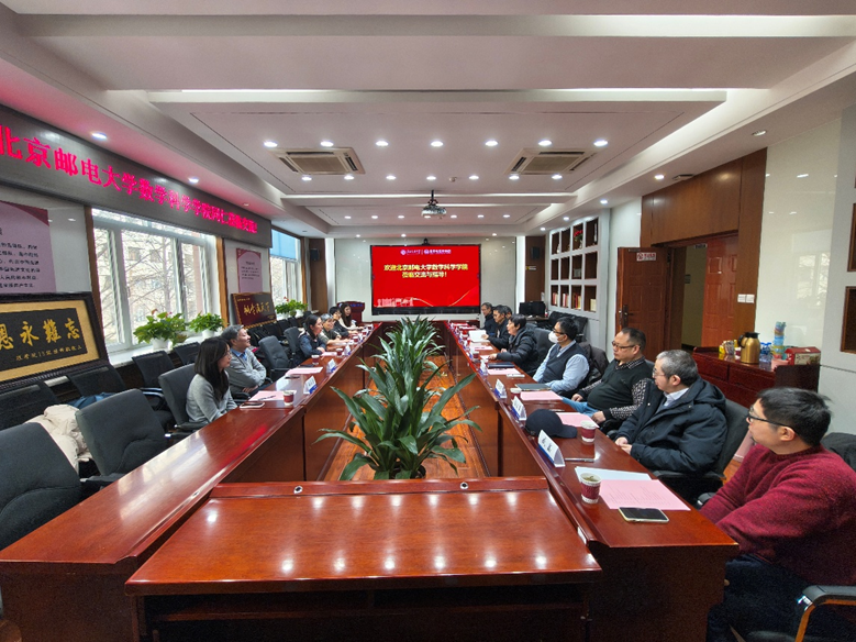 2026年1月9日下午,北京邮电大学数学科学学院副院长袁健华率领应用数学系主任朱萍、大学数学竞赛负责人胡细宝、数学与信息科技科普实验室主任李鹤、概率与统计系副主任徐文哲、教学办主任闫晶晶一行6人,到访数学与统计学院,围绕本科人才培养开展深入交流研讨。数学与统计学院党委书记王烜、党委副书记王浩、副院长孔令臣、数学与应用数学系主任刘迎东、统计与运筹学系主任王立春、数据科学系主任桂文豪、大学数学建模竞赛负责人范秉理、大学数学竞赛指导老师臧鑫以及培养办主任郭昱良参加会议。会议由孔令臣主持。