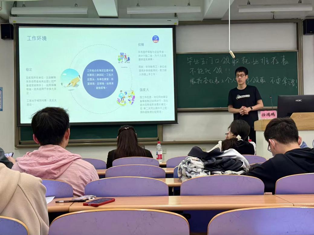 随后,两位优秀校友结合自身职场经历,为学弟学妹们带来实用的就业经验分享。2024届统计学专业硕士毕业生程晓迪,现就职于北京好雅实业有限公司,主要负责项目管理与数据分析工作。她结合入职一年来的项目实践经验,围绕项目管理PMO、数据分析师两大岗位,深入解读岗位职责范畴与行业发展前景。针对同学们的求职需求,她还结合数学与统计专业特色,从求职前期准备、笔试重点突破、面试技巧提升三个维度提出具体建议,为同学们精准对接目标岗位提供清晰指引。